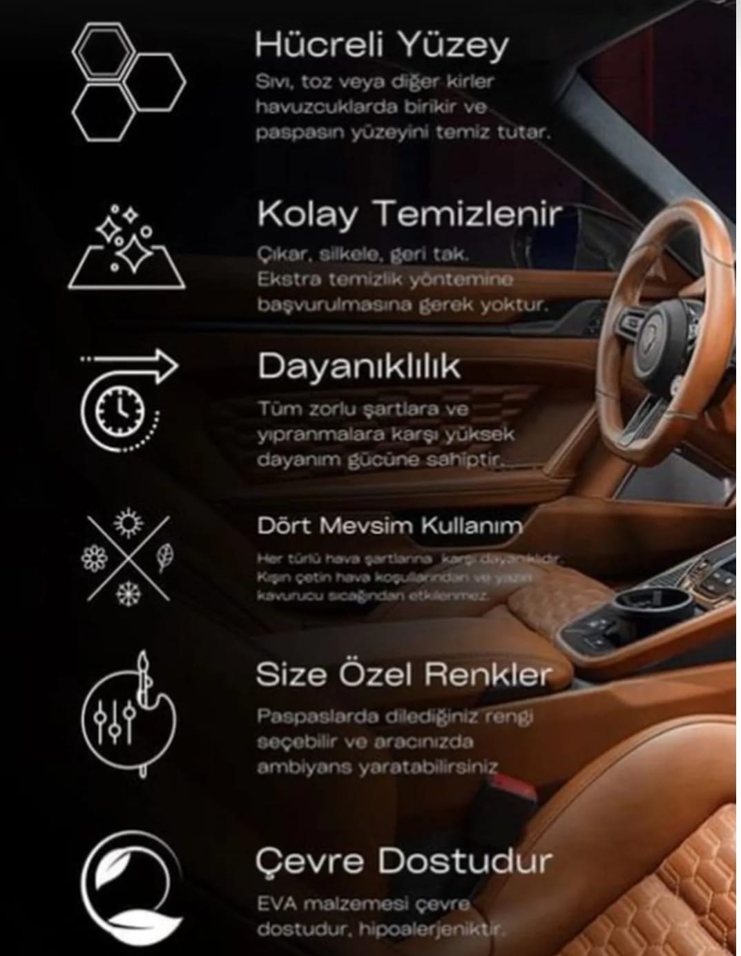 Bu paspaslar, temizlik açısından da büyük kolaylık sunar. Su ve sabunla kolayca temizlenebilir, bu sayede araç içini her zaman taze ve düzenli tutmanıza yardımcı olur. Dökülen sıvılar anında silindiğinde leke bırakmaz ve bu da sürüş keyfinizi artırır.